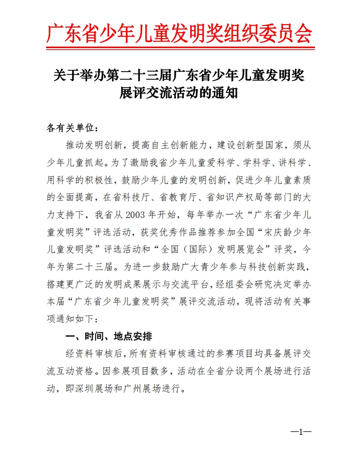 关于举办第二十三届广东省少年儿童发明奖 展评交流活动的通知